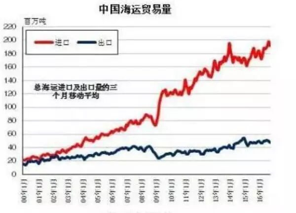 铁矿石进口:今年中国海运进口量增长的很大一部分是由进口铁矿石所贡献的。今年以来国内钢材市场逐步回暖,而国产矿产量大幅下滑,国内钢企对进口矿的需求大幅增加。与此同时,受“供给侧改革”和环保的影响,以及其他原料成本上升,进一步刺激了国内钢厂对进口铁矿石(尤其是高品位进口铁矿石)的需求。